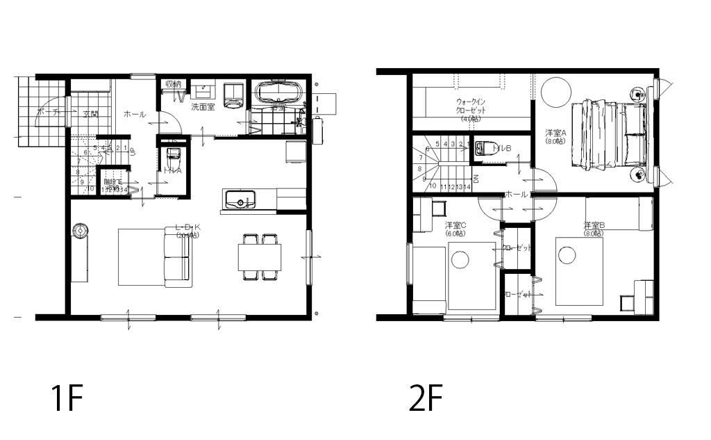 2階には3つの洋室を配置し、主寝室には大容量のウォークインクローゼットを完備。子ども部屋や書斎として使える居室もあり、ライフスタイルや家族の成長に合わせて柔軟に活用できます。中央のホールや収納スペースによって動線も快適で、日々の暮らしに寄り添った住まいです。